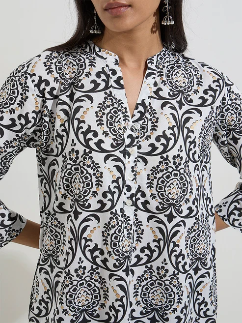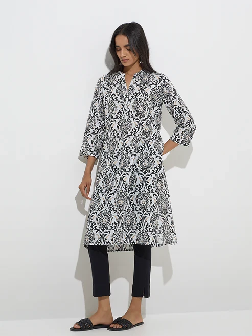 This black kurta from Utsa is woven from a cotton-rich fabric and showcases Mughal-inspired prints for a traditional yet timeless appeal. Tailored in a straight silhouette, it features a mandarin neckline that extends to a short button placket, while three-quarter sleeves complete the look.