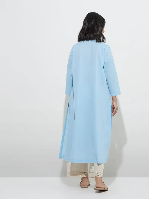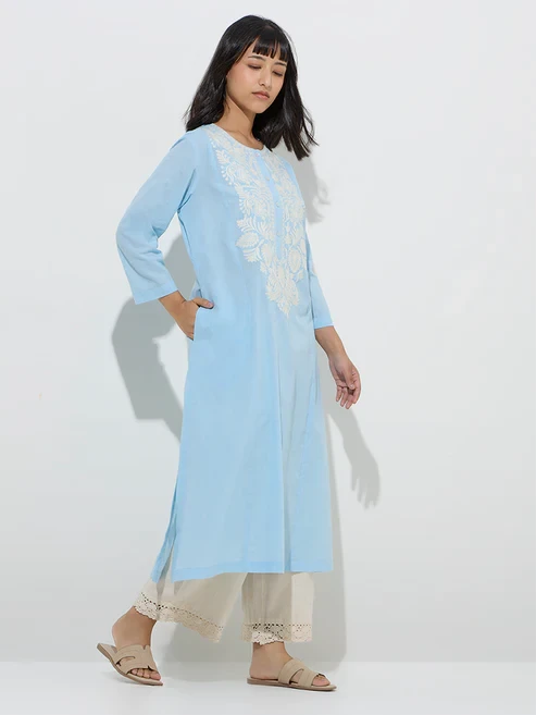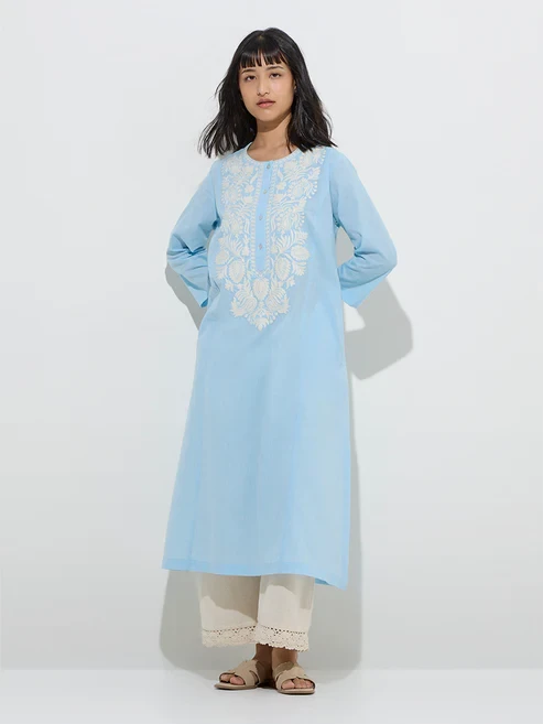 This light blue kurta from Utsa is sculpted in a graceful A-line silhouette and adorned with delicate floral embroidery at the yoke. Woven from pure cotton, it features a round neck, full sleeves, and functional slip pockets for added ease.