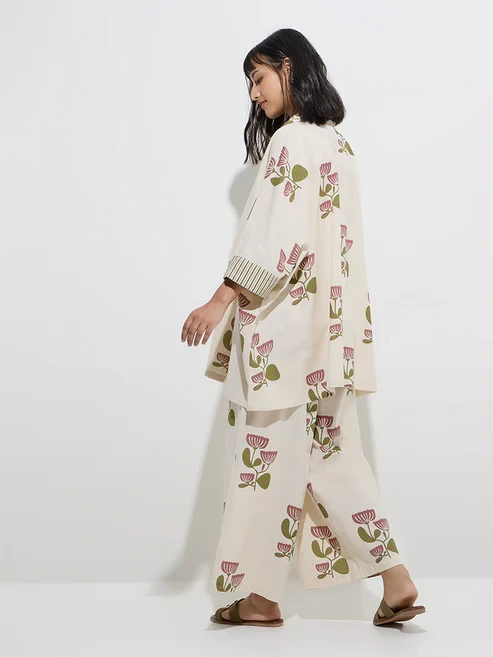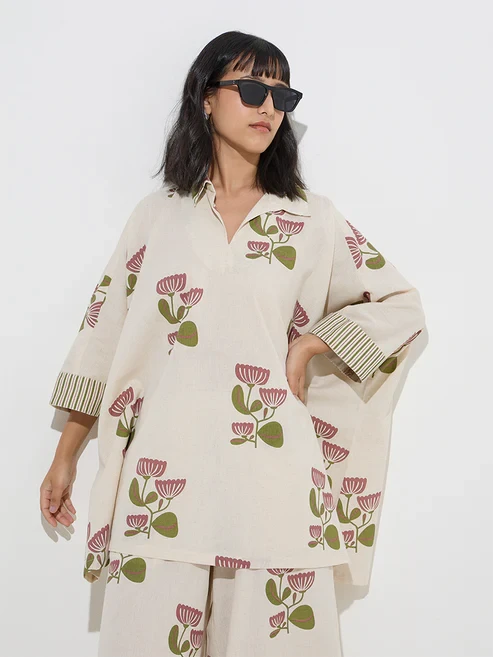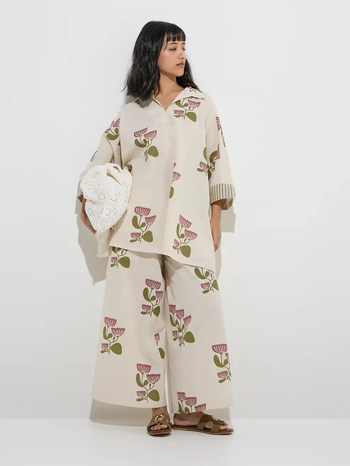 This off-white co-ord set from Utsa is detailed with delicate floral prints all-over. Woven from a premium cotton-linen blend, it features a collared and dolman sleeves, ensuring a relaxed yet sophisticated look.