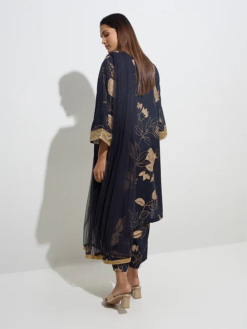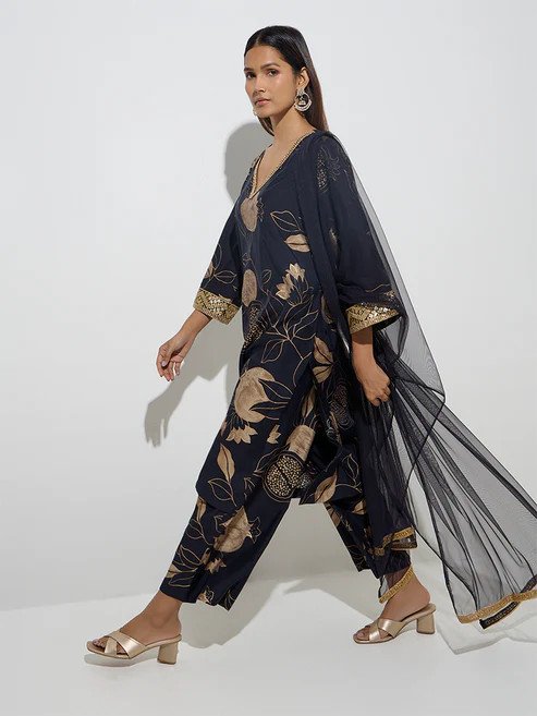 This black ethnic set from Vark exudes elegance with its intricate anar motifs. The A-line kurta is designed with a flattering V-neck and three quarter sleeves, offering a graceful silhouette. Paired with matching palazzos featuring a smooth elasticized waistband for all-day comfort, the set is completed with a delicate net dupatta adorned with exquisite zari embroidery.