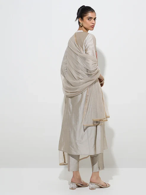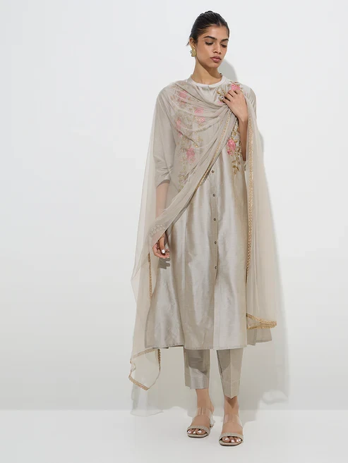 This grey ethnic set from Vark showcases floral embroidery for an elegant touch. The A-line kurta is designed with a band neck, a button-up front, and three-quarter sleeves. It is paired with matching ethnic pants featuring an elasticized waistband for a comfortable fit. Completing the ensemble is a delicate net dupatta, accented with exquisite zari trims for a refined finish.