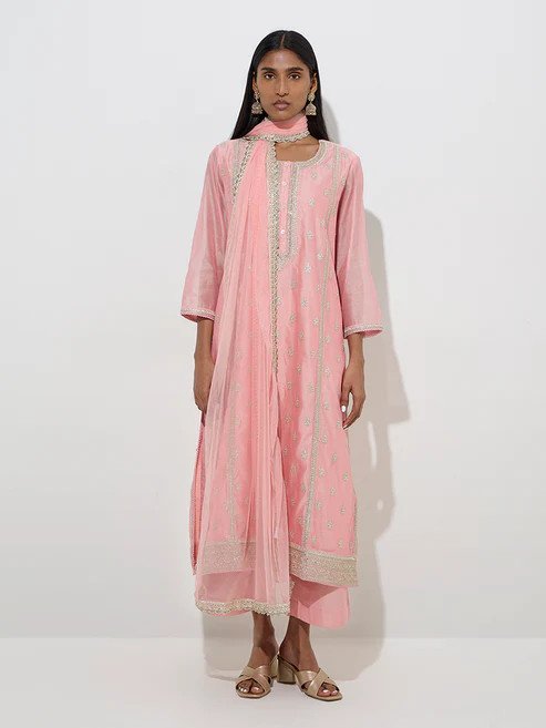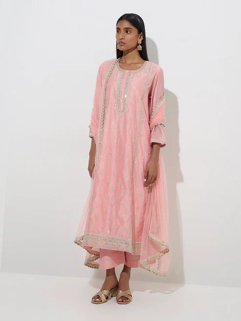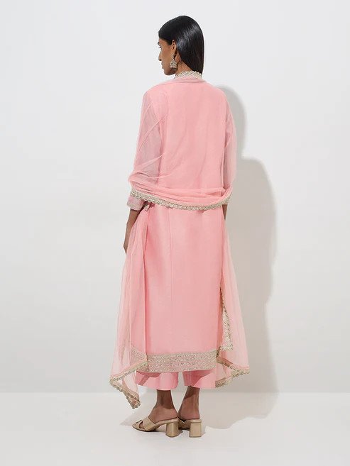 Radiating grace and sophistication, this light pink ethnic set from Vark is adorned with delicate zari embroidery. The A-line kurta features a round neck and three-fourth sleeves for an elegant appeal. Paired with palazzos, the ensemble is completed with a net dupatta, beautifully finished with zari trims.