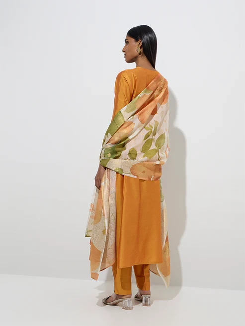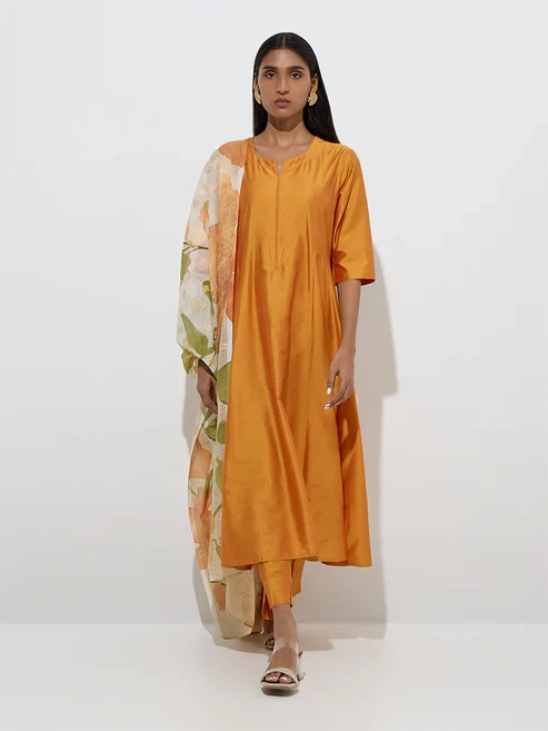This orange ethnic set from Vark is woven from a luxurious fabric, ensuring all-day comfort. The solid kurta is tailored in a flattering A-line silhouette, featuring a round neckline and three-quarter sleeves for a refined touch. It is paired with matching ethnic pants for a seamless fit, while a floral-printed dupatta adorned with gold-toned embroidery adds a graceful finish.