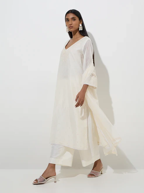Embrace ethereal elegance with this white kurta set from Vark, tailored from a luxurious blended-cotton fabric. Shaped in a graceful A-line silhouette, the kurta is adorned with intricate floral embroidery, enhanced by a flattering V-neck and three-quarter sleeves. It is paired with flowy palazzos for effortless movement, while a delicate net dupatta with a crochet-trimmed border adds the perfect finishing touch.